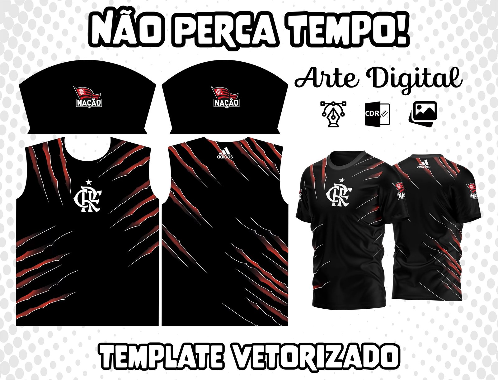 - Arquivo CDR (.cdr x7) com design completo baseado na camisa oficial do Flamengo, apresentado em alta resolução.