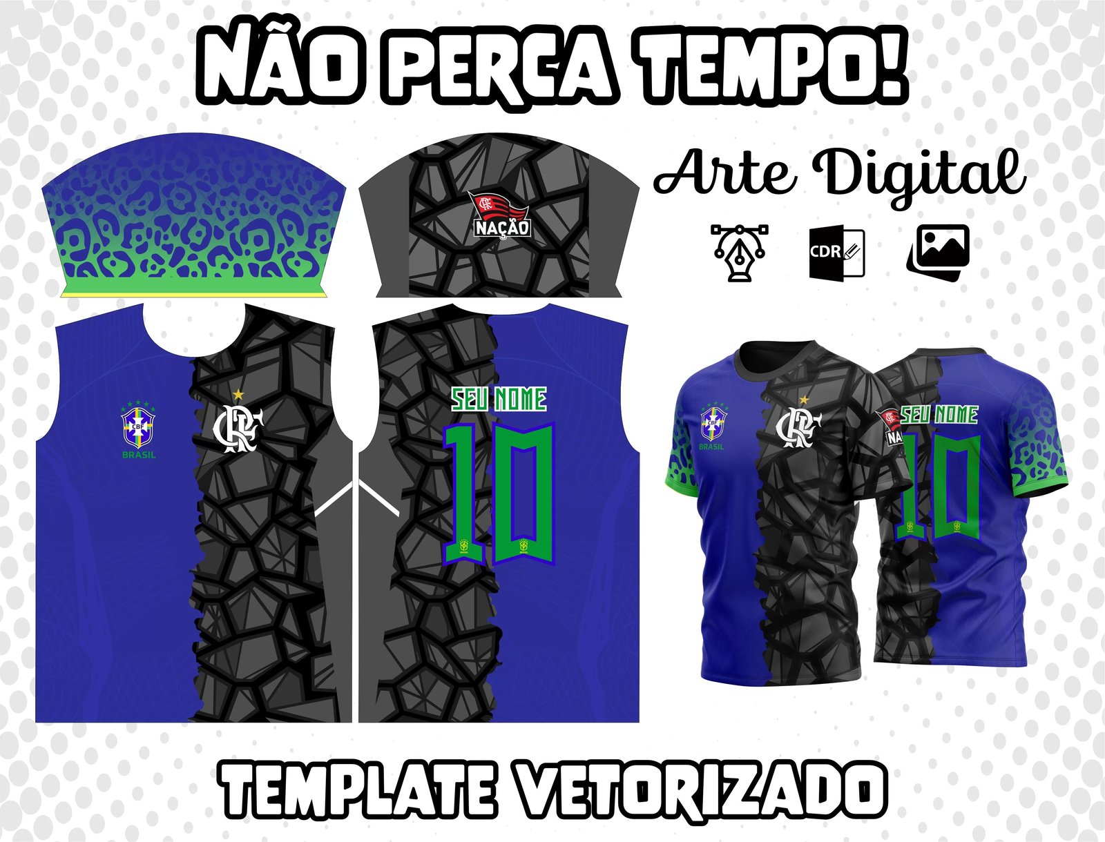 A arte para camiseta metade Flamengo, metade Brasil é perfeita para quem quer demonstrar sua paixão pelos dois amores. A estampa personalizada e criativa permite que os torcedores mostrem sua identidade única de maneira autêntica. Com a sublimação, a qualidade e durabilidade da camisa estampada são garantidas. Adquira já a sua e mostre sua torcida com estilo!