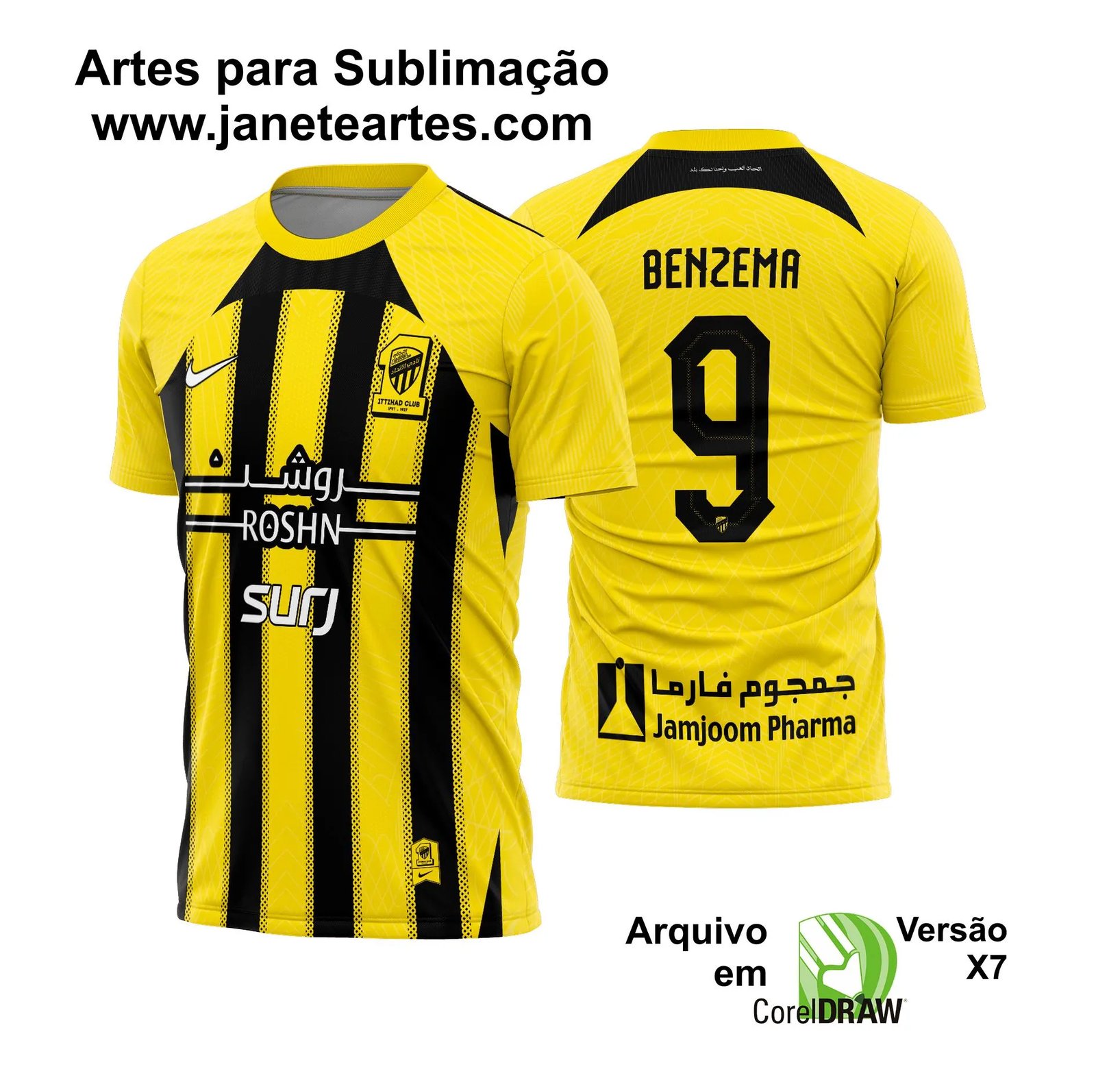 O arquivo está no formato CDR (.cdr x7), compatível com a maioria dos softwares de design gráfico, permitindo edições e ajustes conforme a necessidade. A Arte Vetor Camisa Al-Ittihad proporciona flexibilidade e precisão, mantendo a qualidade em qualquer adaptação, seja para camisetas de diferentes materiais, seja para outros itens sublimáveis, como almofadas e chaveiros.
