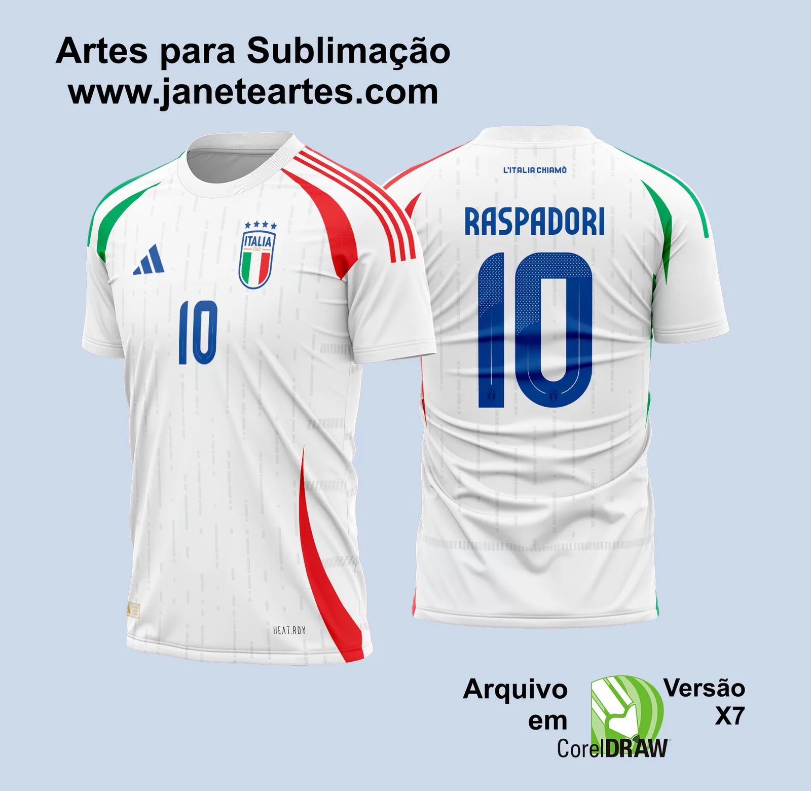 Desenvolvida com uma atenção meticulosa aos detalhes, nossa arte vetorial oferece uma reprodução precisa e vibrante da camisa da seleção italiana, garantindo que seus projetos de sublimação se destaquem pela fidelidade e pela estética refinada que são marcas registradas da Itália. Ideal para produzir mercadorias personalizadas, enriquecer coleções pessoais ou para presentear, nossa arte digital é sinônimo de qualidade e exclusividade.