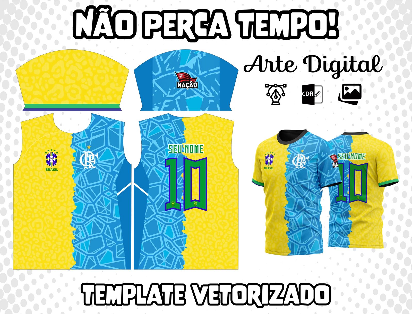 A arte para camiseta metade Flamengo, metade Brasil é perfeita para quem quer demonstrar sua paixão pelos dois amores. A estampa personalizada e criativa permite que os torcedores mostrem sua identidade única de maneira autêntica. Com a sublimação, a qualidade e durabilidade da camisa estampada são garantidas. Adquira já a sua e mostre sua torcida com estilo!