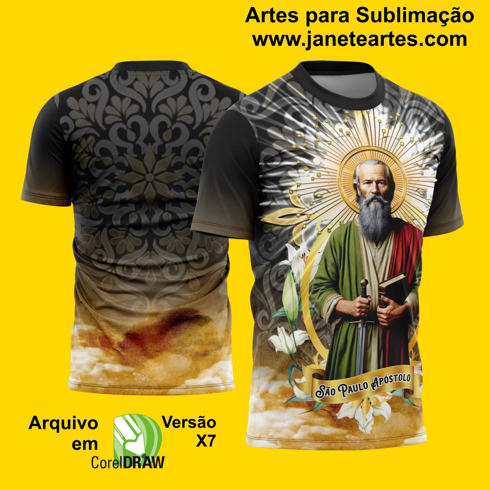 O design apresenta detalhes que destacam a figura de São Paulo Apóstolo, perfeito para ocasiões religiosas, eventos especiais ou até mesmo como presente. Seu estilo versátil e elegante garante que ele possa ser usado em diversas aplicações, indo muito além das camisetas.