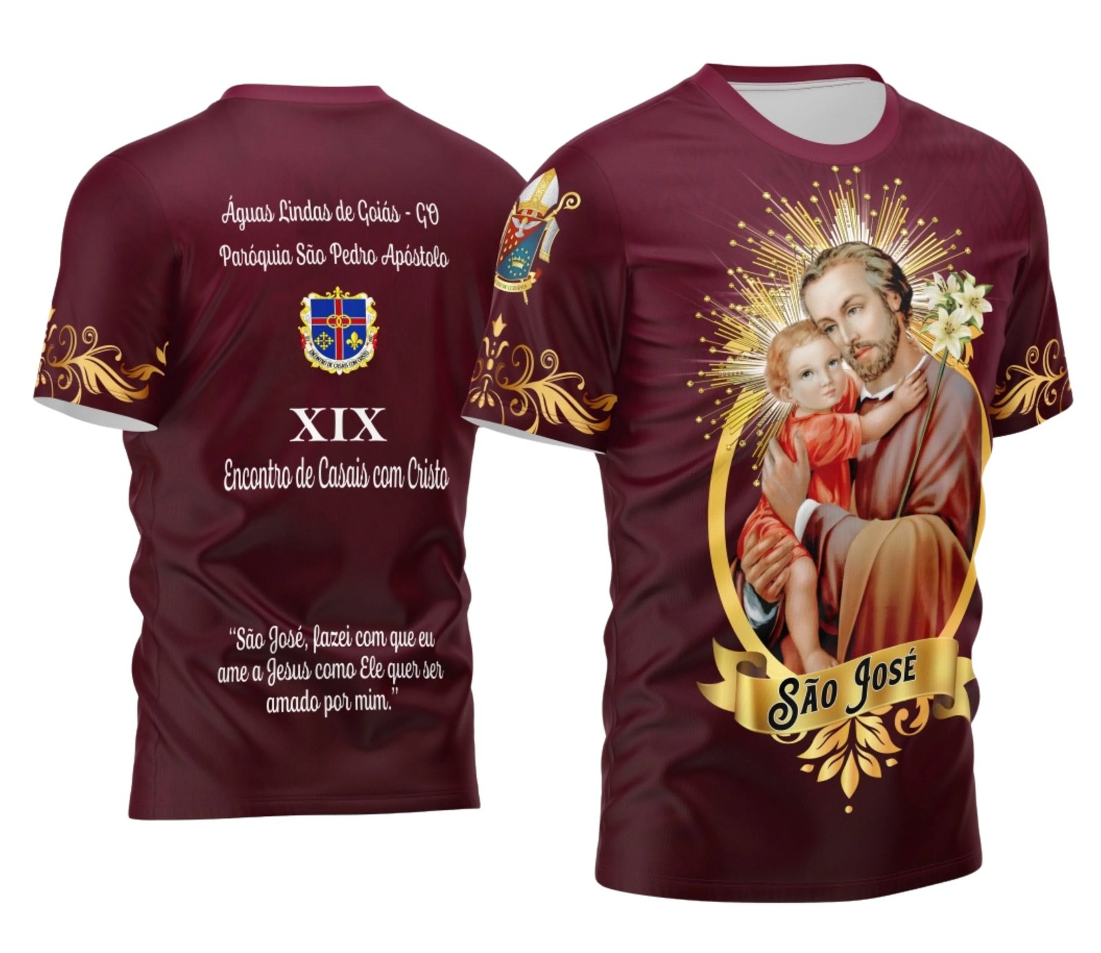 Ao adquirir a arte, João percebeu que poderia personalizar sua camisa com a figura imponente de São José estampada nas costas e o logo delicado no peito, um sinal discreto e elegante de sua devoção. Para ele, isso não era apenas uma estampa, mas uma expressão visual de fé, conforto e proteção durante os momentos importantes de missa, encontro religioso ou celebração familiar.