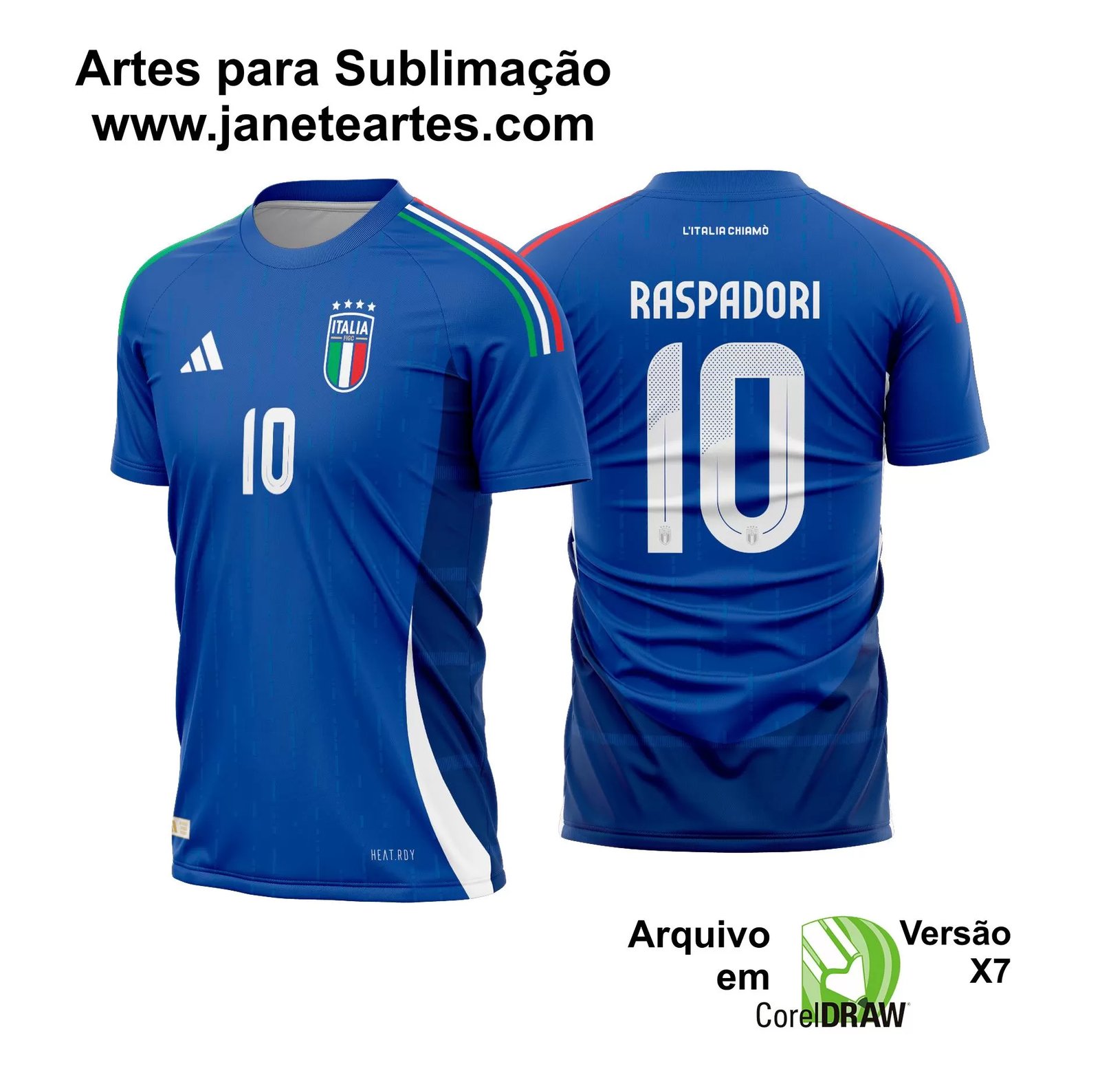 Desenvolvida com uma atenção meticulosa aos detalhes, nossa arte vetorial oferece uma reprodução precisa e vibrante da camisa da seleção italiana, garantindo que seus projetos de sublimação se destaquem pela fidelidade e pela estética refinada que são marcas registradas da Itália. Ideal para produzir mercadorias personalizadas, enriquecer coleções pessoais ou para presentear, nossa arte digital é sinônimo de qualidade e exclusividade.