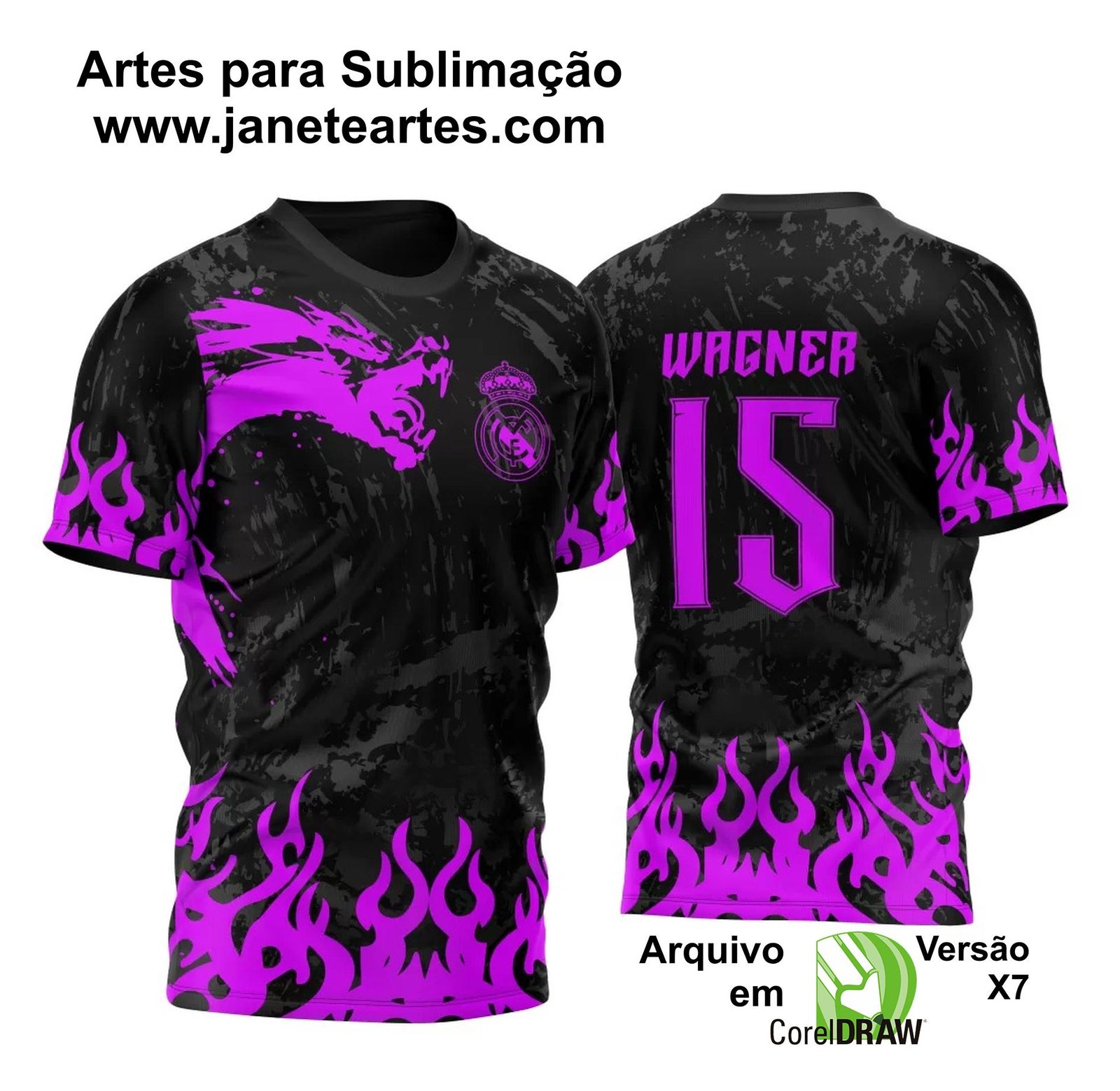 Apresentamos a Arte Vetor Camisa Para InterClasse Real Madrid Pincel Dragão 2023, um design exclusivo que combina a paixão pelo futebol com elementos artísticos inspirados na figura poderosa do dragão. Criado pensando nas partidas interclasses, este design tem tudo para fazer sua equipe se destacar.