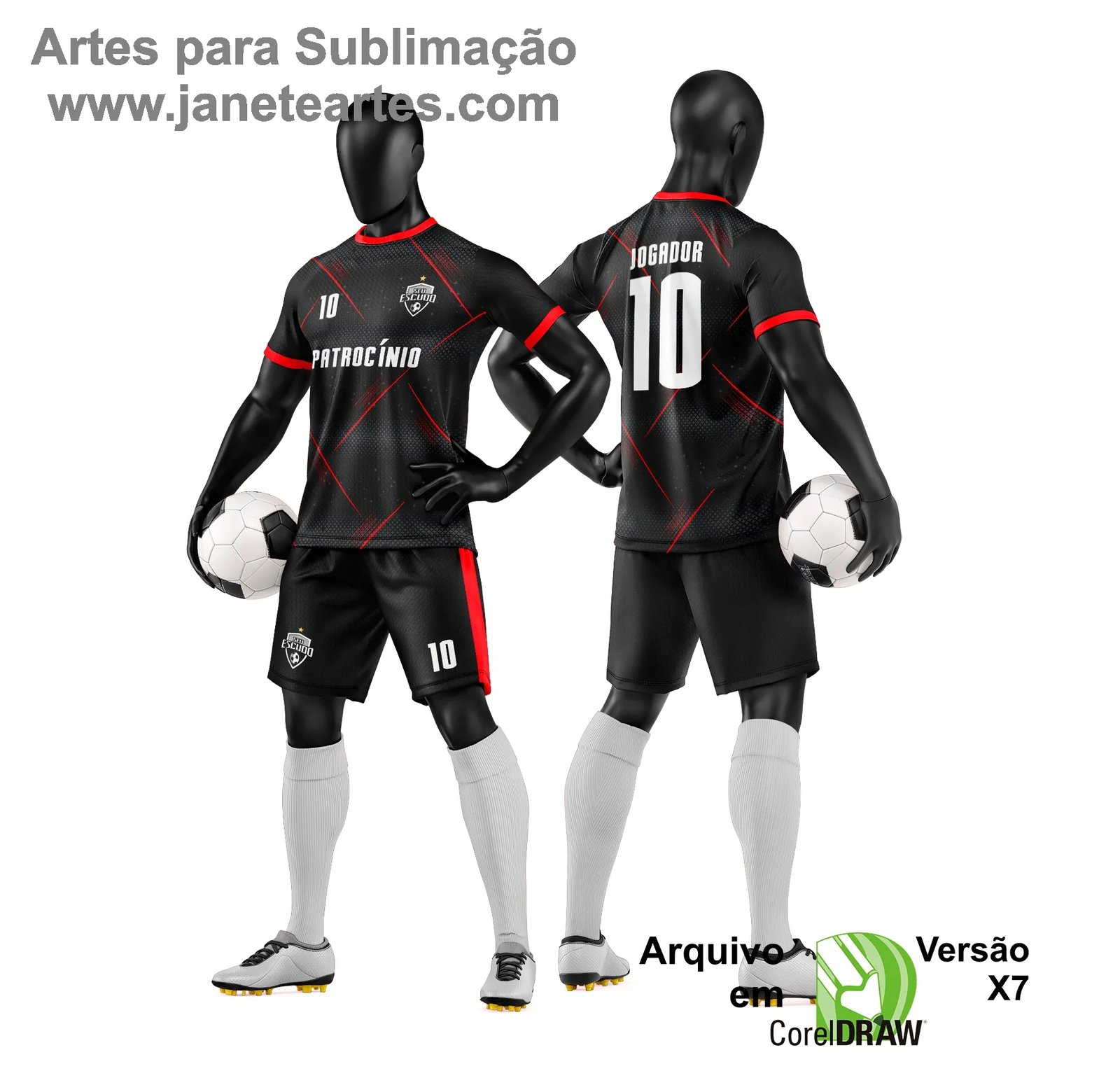 A Arte Vetor Camisa e Short de Time de Futebol Amador foi pensada para facilitar o seu trabalho de personalização 👕. Basta abrir o arquivo no seu editor de vetores compatível com CDR e fazer os ajustes desejados, como nome, número e cores do time 🧩.