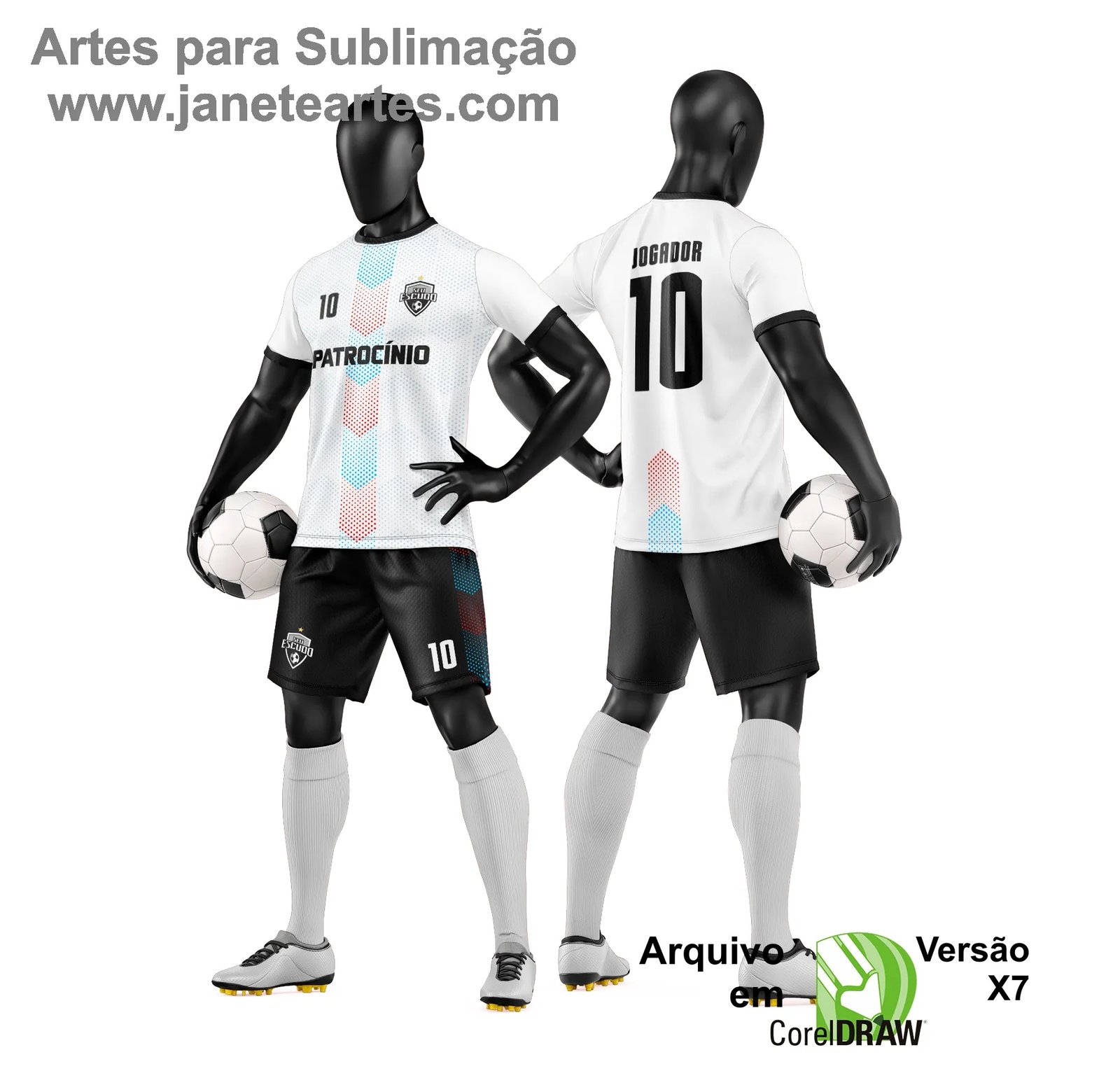 A Arte Vetor Camisa e Short de Time de Futebol Amador foi pensada para facilitar o seu trabalho de personalização 👕. Basta abrir o arquivo no seu editor de vetores compatível com CDR e fazer os ajustes desejados, como nome, número e cores do time 🧩.