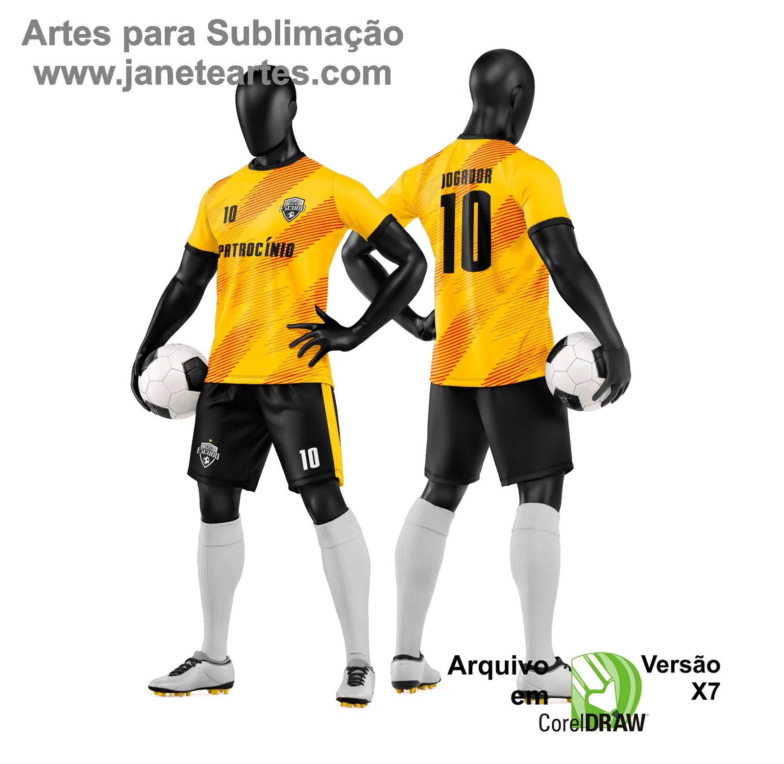 A Arte Vetor Camisa e Short de Time de Futebol Amador foi pensada para facilitar o seu trabalho de personalização 👕. Basta abrir o arquivo no seu editor de vetores compatível com CDR e fazer os ajustes desejados, como nome, número e cores do time 🧩.