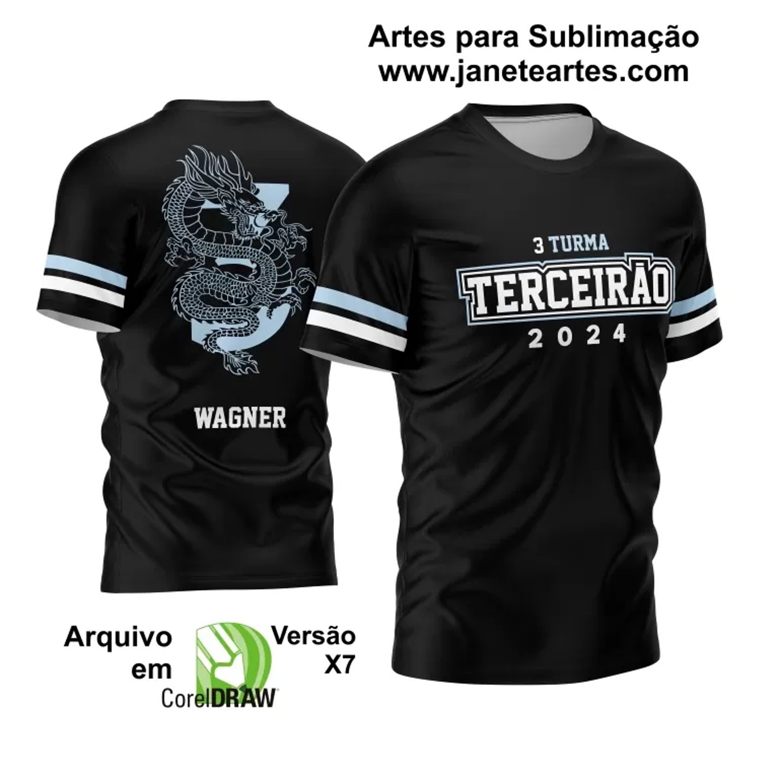 Além de camisetas, a versatilidade da Arte Vetor Estampa Camisa Terceirão Dragão 2026 se estende a uma variedade de itens personalizáveis. Cada aluno pode expressar seu estilo único, criando um conjunto de moda escolar completo com tema de dragão, perfeito para eventos, festas de formatura, ou para exibir no dia a dia.