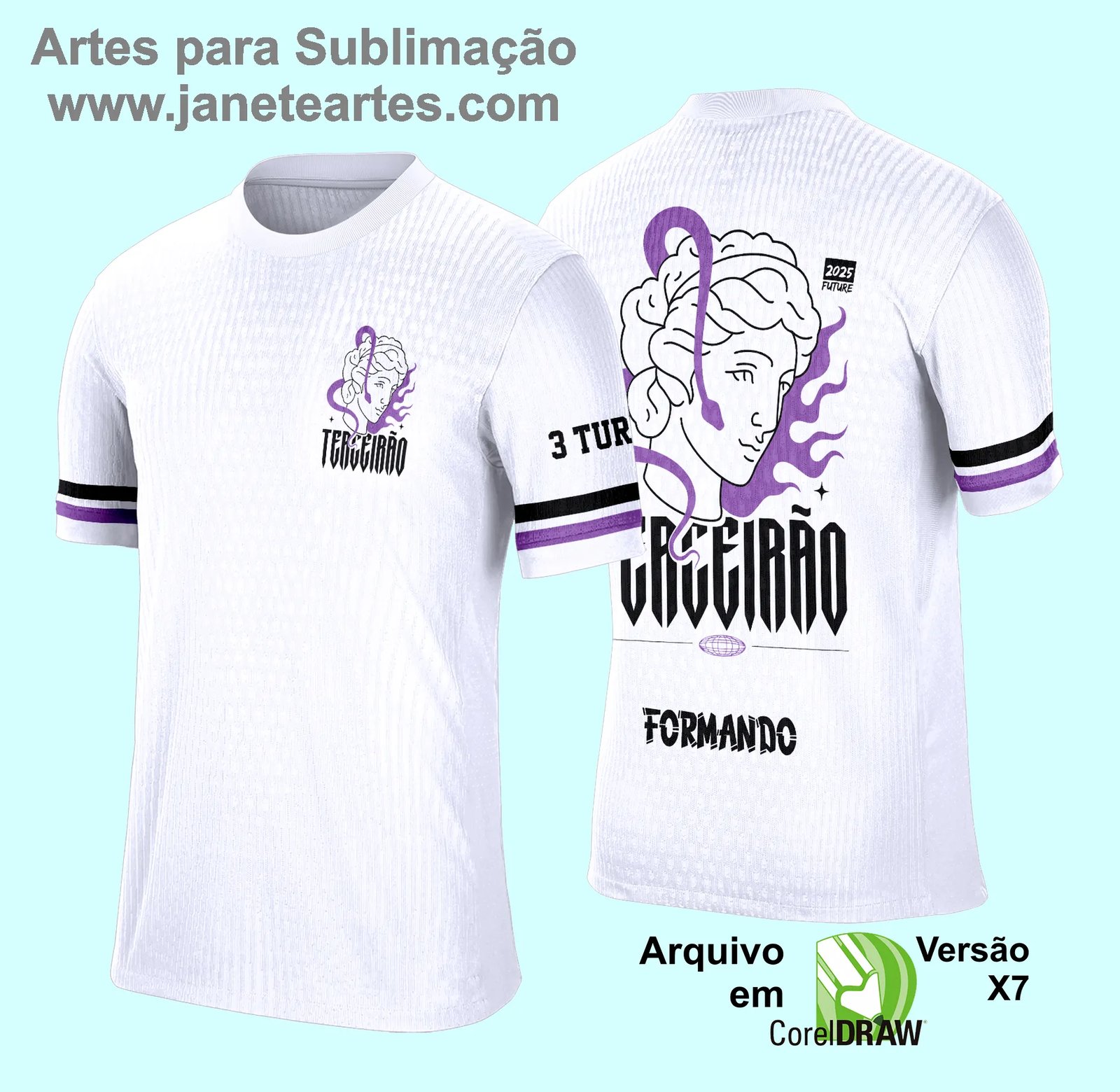 Este arquivo serve para personalizar camisas destinadas à sua turma do Terceirão. Você pode levar o arquivo a uma gráfica especializada para impressão em silk, sublimação ou transfer, garantindo assim a reprodução fiel da arte.
