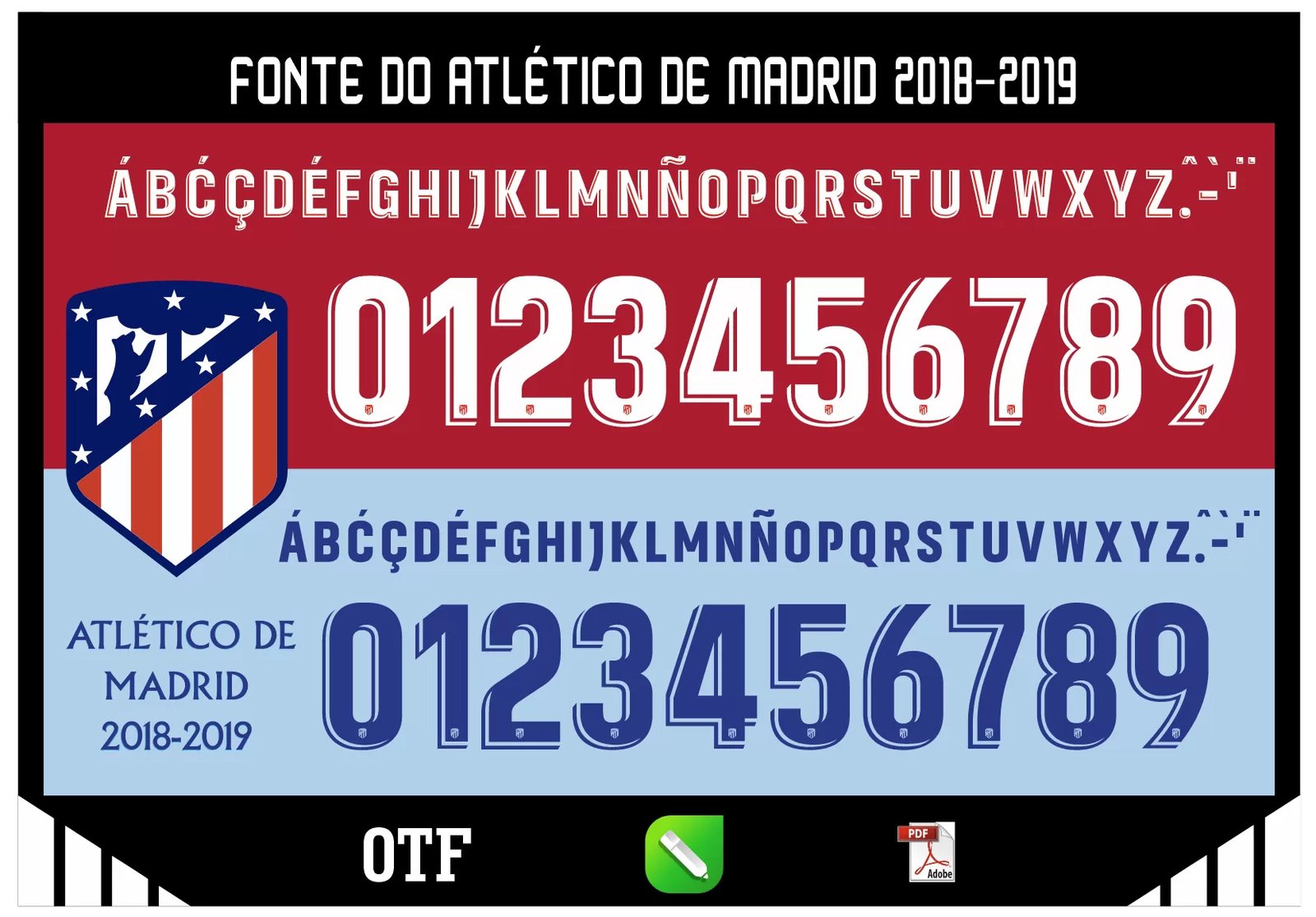 Atenção: Este é um produto digital! Adquirindo a FONTE ATLETICO DE MADRID 2019-2019, você receberá um arquivo no formato CDR (.cdr x7), TTF e PDF por e-mail. Ele também ficará disponível para download na área do cliente em nosso site após a confirmação do pagamento.