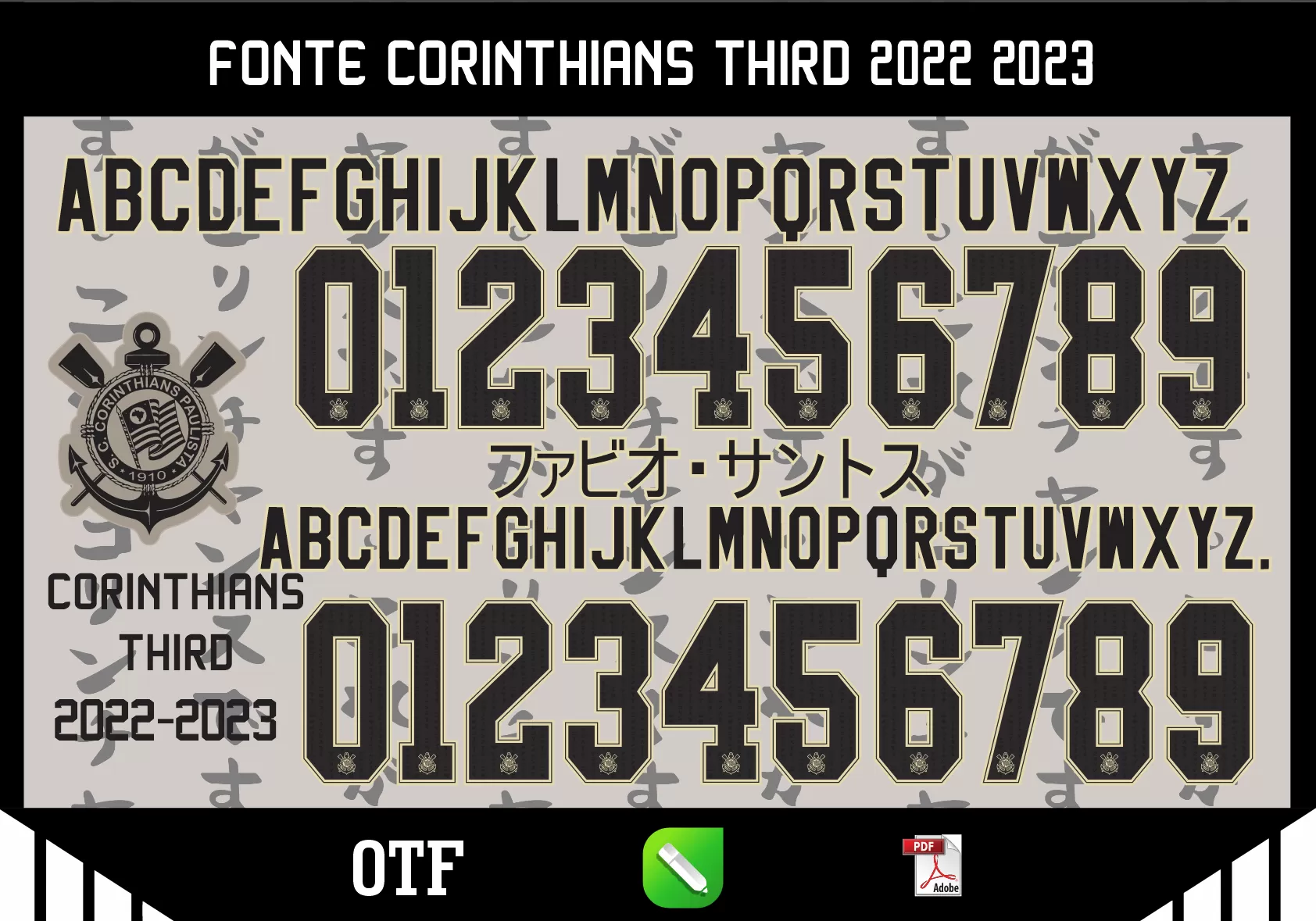 Atenção: Este é um produto digital! Adquirindo a Fonte Corinthians Third 2022-23, você receberá um arquivo no formato CDR (.cdr x7), TTF e PDF por e-mail. Ele também ficará disponível para download na área do cliente em nosso site após a confirmação do pagamento.