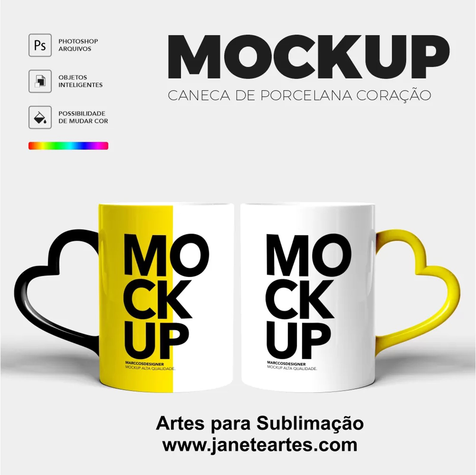 O Mockup Caneca com Alça de Coração é uma ferramenta essencial para quem deseja dar um toque especial às suas criações. Ideal para designers, empreendedores e apaixonados por sublimação, este mockup permite a criação de designs únicos em canecas, destacando-se por sua alça em formato de coração.