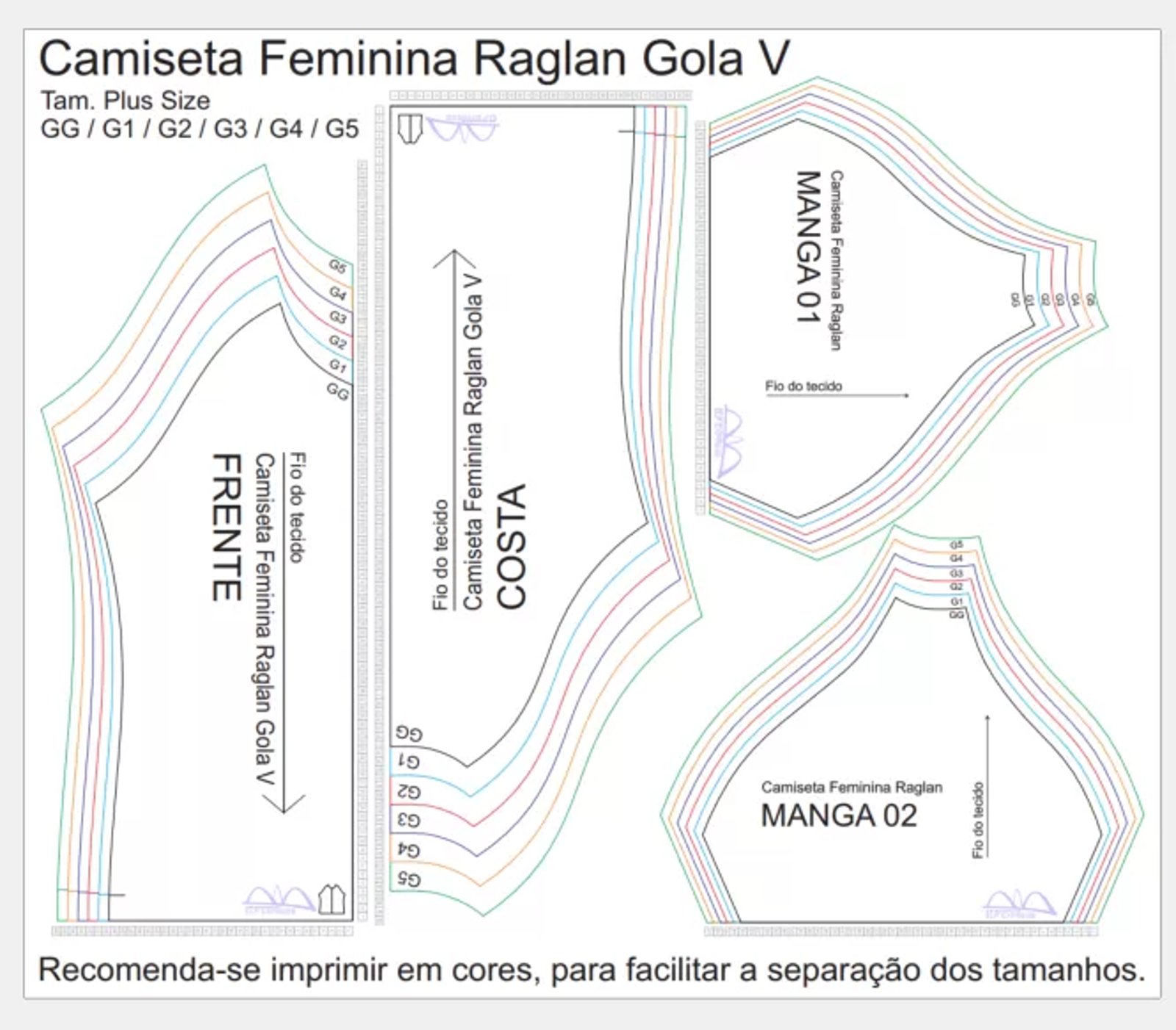 Molde de Costura Para Imprimir Camiseta - 11 - Baby Look Raglan Feminina Gola V Manga Curta (GG ao G5)