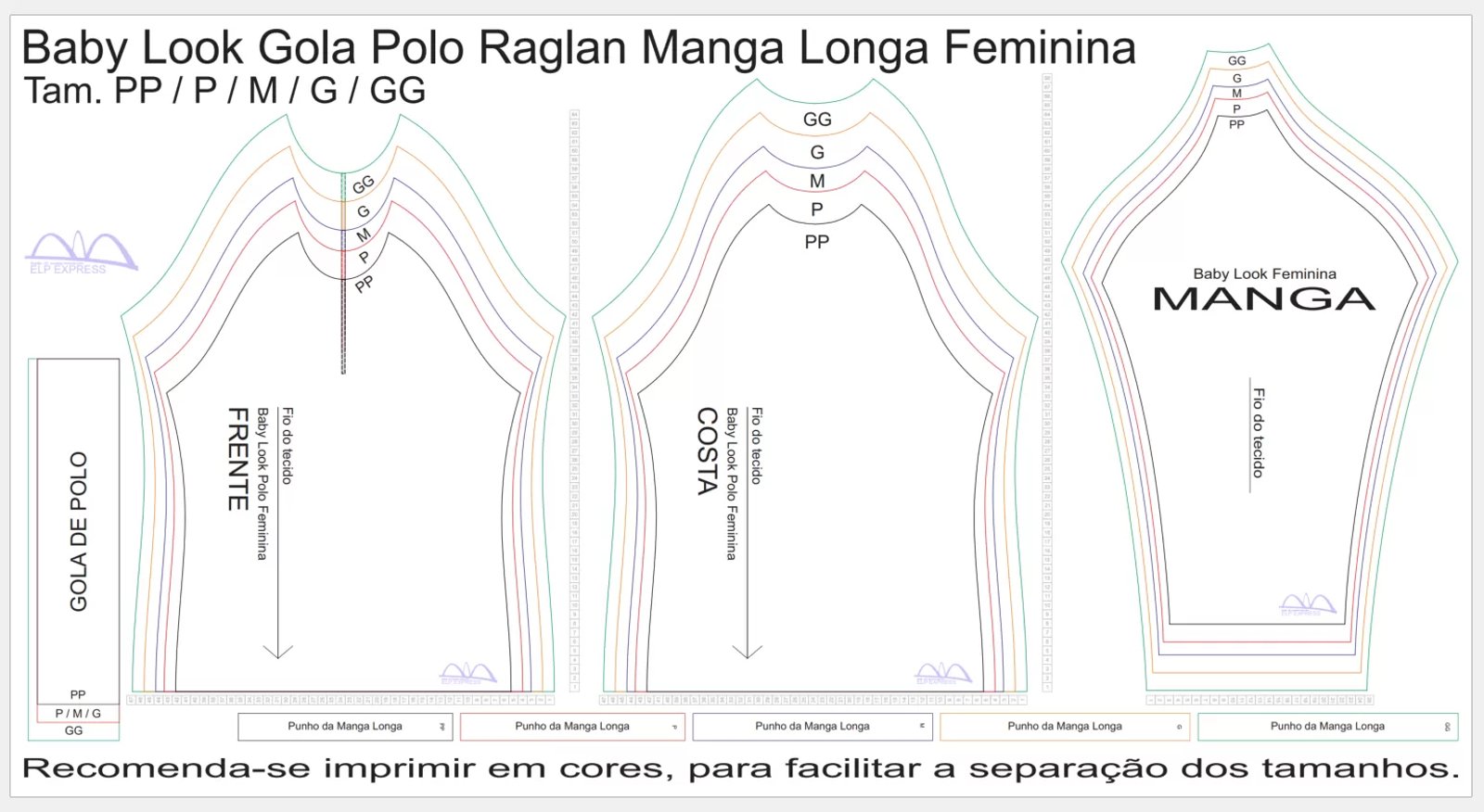 Molde de Costura Para Imprimir Camiseta - 18 - Baby look Gola Polo Raglan Manga Longa (PP - GG)