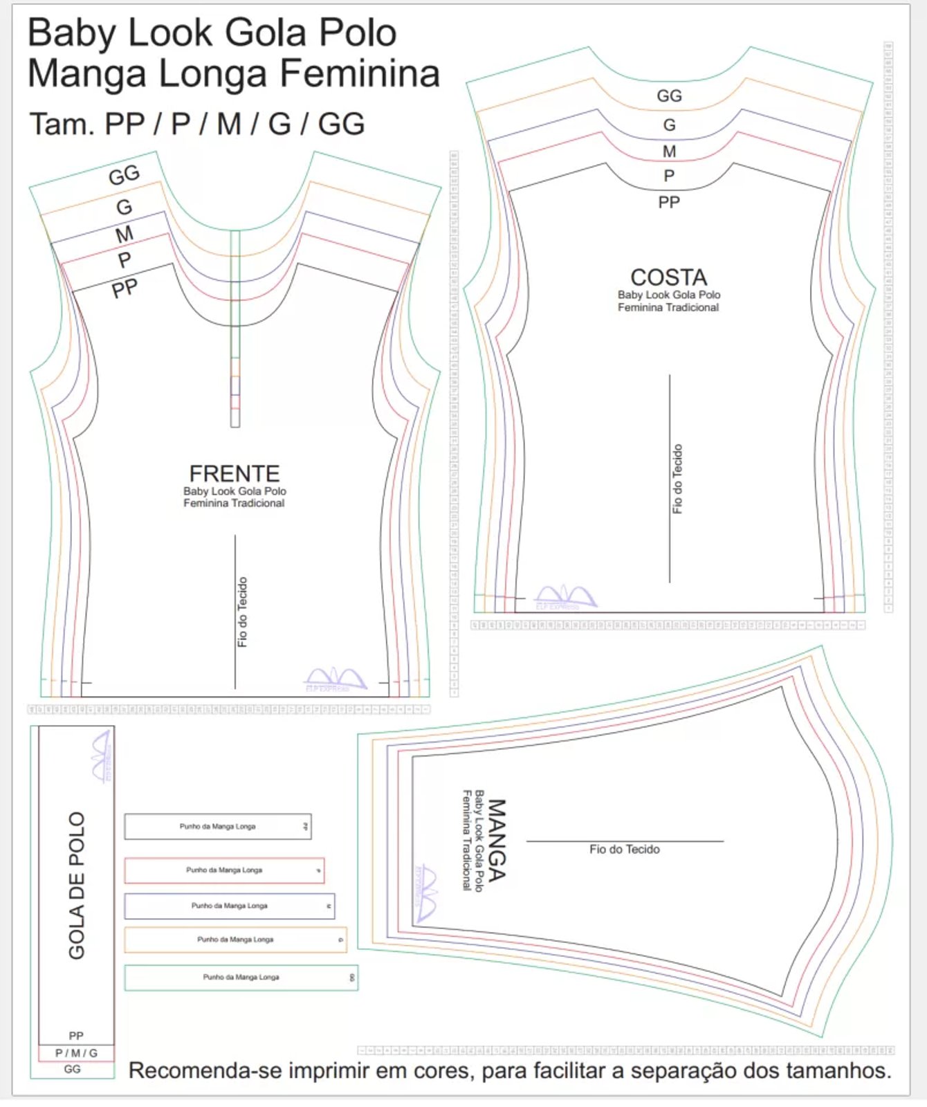 Molde de Costura Para Imprimir Camiseta - 20 - Baby look Gola Polo Tradicional Manga Longa (PP ao GG)