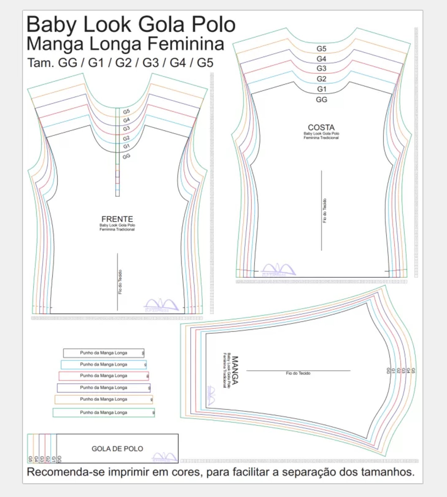 Molde de Costura Para Imprimir Camiseta - 24 - Baby look Gola Polo Tradicional Manga Longa (GG ao G5)