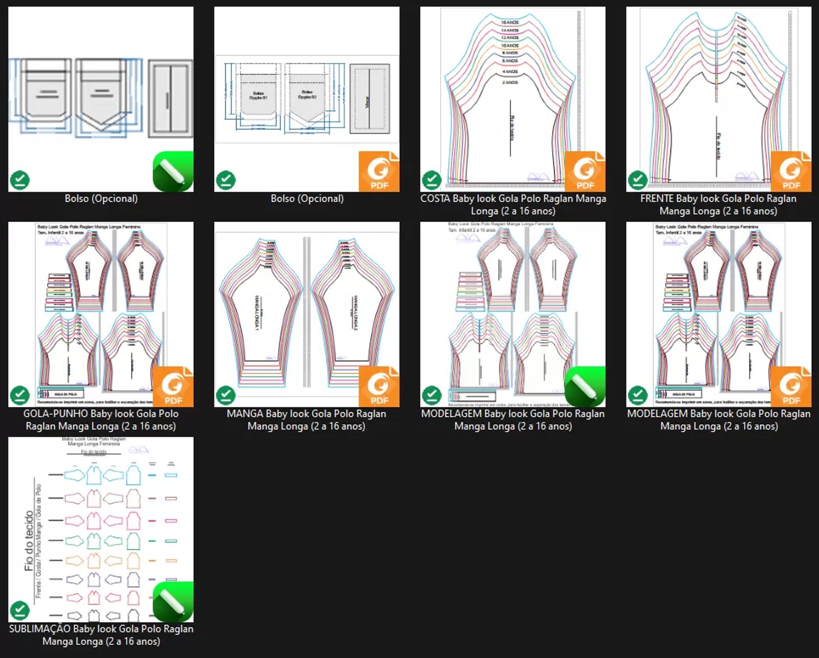 - O arquivo contém molde completo para camisetas baby look com gola polo e manga raglan longa, ideal para crianças de 2 a 16 anos.