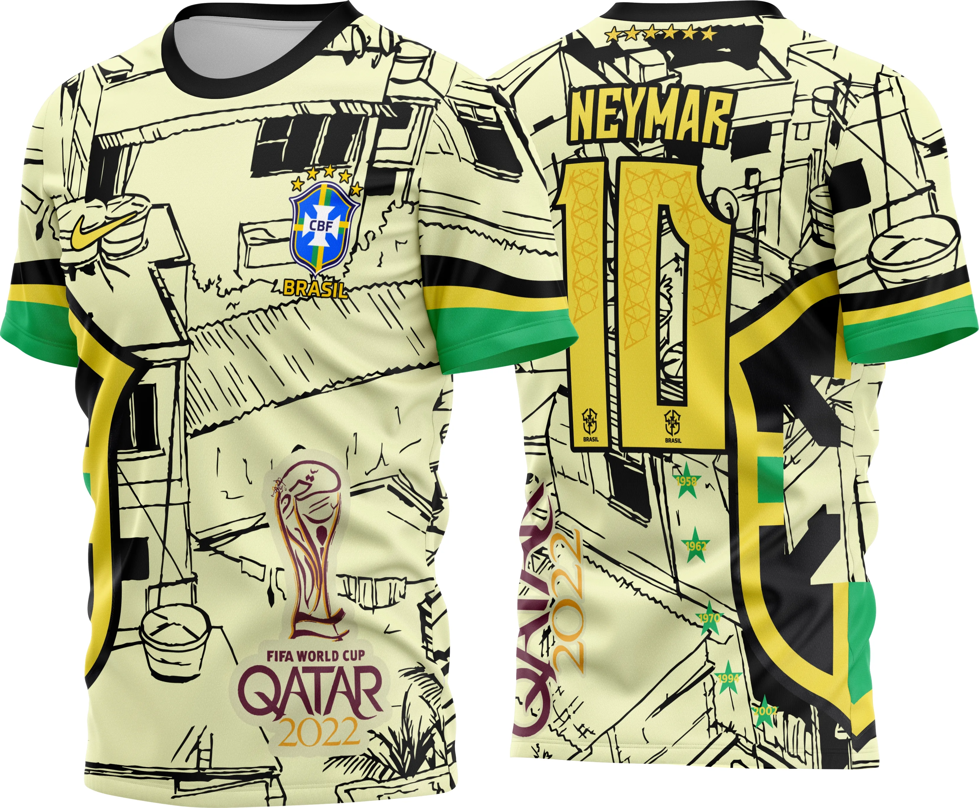 Experimente o Arte Camisa Brasil Favela Qatar 2022 para destacar sua torcida com estilo e orgulho, levando a paixão pela seleção e a realidade das favelas para as ruas e estádios! 🌟⚽🇧🇷