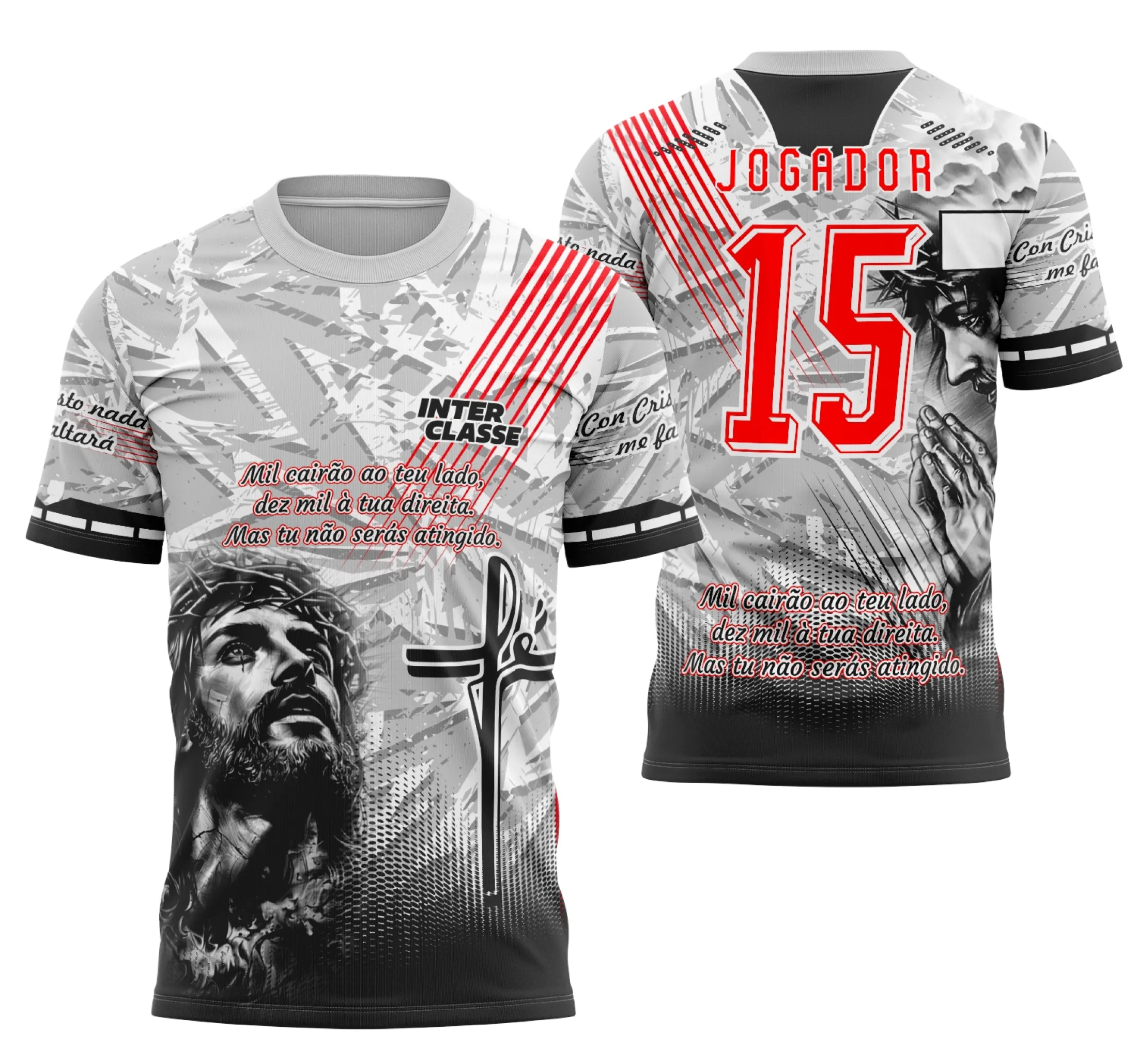 Inspirada na mensagem de fé e superação representada por Jesus Cristo, a Arte Camisa Interclasse Futebol Jesus Cristo – Time Escolar Cristão se adapta perfeitamente a projetos esportivos que desejam ir além do visual comum. Ela permite a criação de camisas marcantes, com presença forte, linguagem visual clara e impacto imediato.